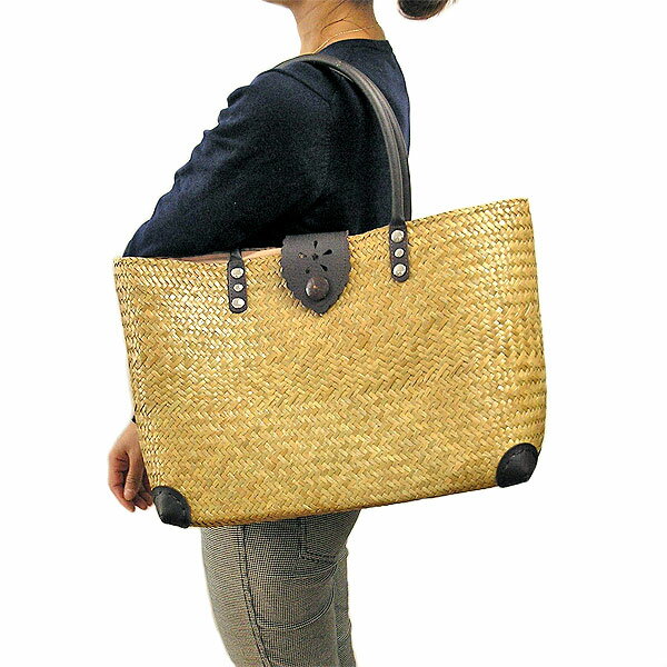 ご注文の前・後で欠品となる場合があります ■サイズ バッグ部分高さ約28cmx横幅最大約40〜45cm 持ち手高さ 約20cm マチ約12cm 重量約450g ■素材 カゴ部分:カチュー持ち手部分:革 ■ご注意 ※天然の素材を使用している為、本体部分に傷や汚れ、また「ゆがみ」「よじれ」等がある場合がございます。