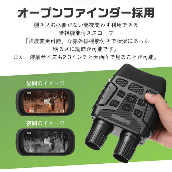 赤外線機能搭載 肉眼では見えない暗闇でも赤外線によって鮮明に写し出します ●覗き込む必要がない昼夜問わず利用できる暗視機能付きスコープ 「強度変更可能」な赤外線機能付きで状況にあった明るさに調節が可能です。